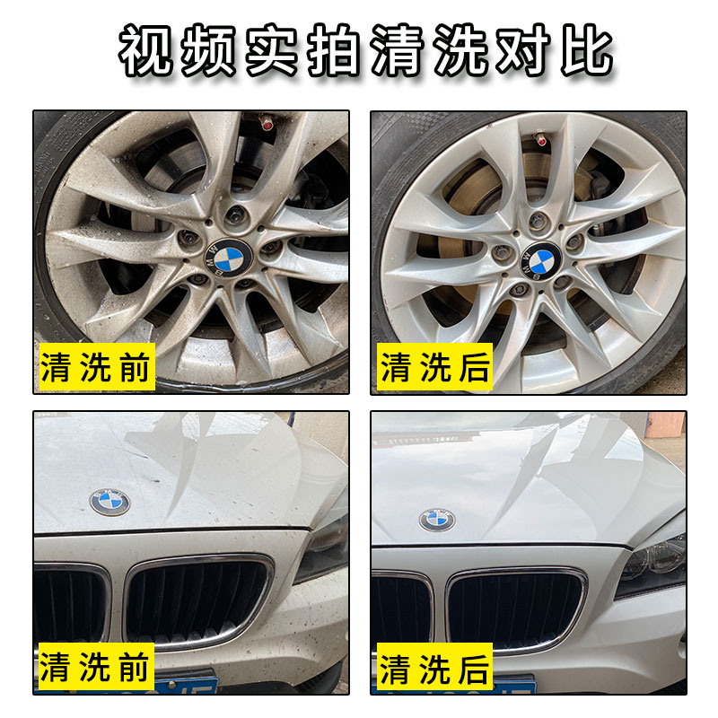 把全效自潔素和水按照1:30的比例混合均勻,噴于輪轂之后,用毛刷清洗輪轂,然后用高壓水槍沖洗干凈即可。