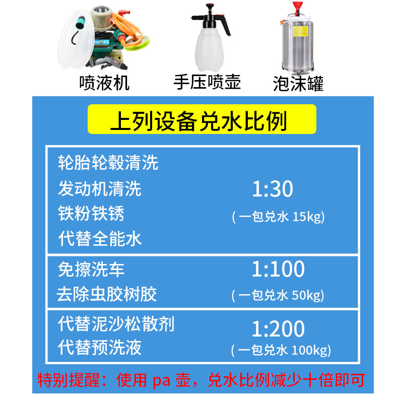 把全效自潔素和水按照1:20~30的比例混合均勻,噴于輪胎輪轂,等待三分鐘待污漬分解,用高壓水槍由下而上沖洗干凈即可;槍壓≥6MPa,壓力越大效果越好。